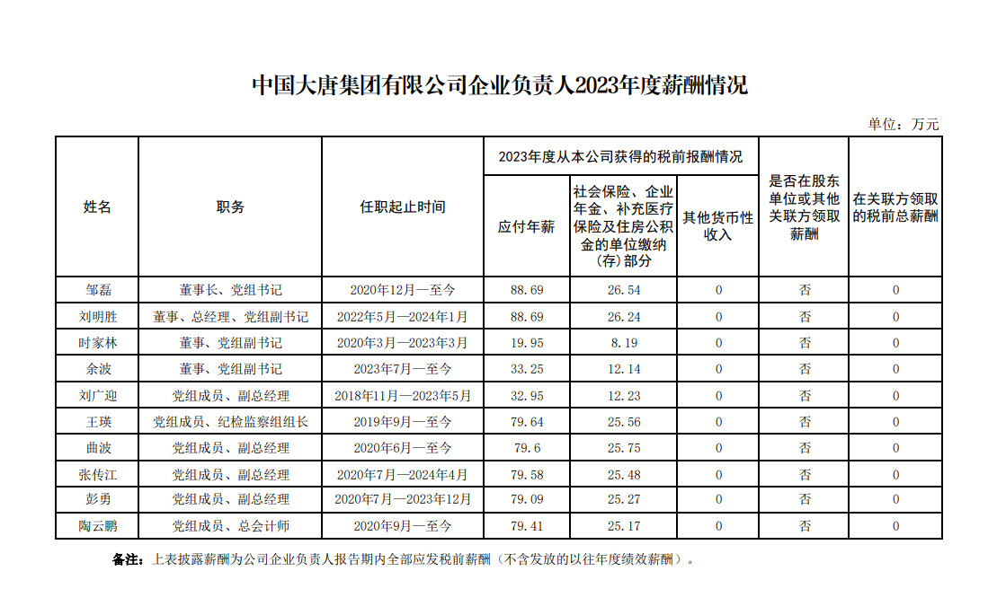 中國大唐集團有限公司企業負責人2023年度薪酬情況